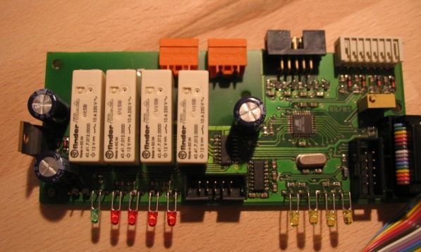 Die Ansteuerung der +12V Relais erfolgt über einen ULN2003-Treiber, der direkt vom AVR-Controller angesteuert wird. Die digitalen Eingänge an ST5 sind alle Low-Aktiv und gegen positive Überspannungen durch Dioden geschützt. Bei den analogen Eingängen an SV4 ist neben einem Überspannungsschutz durch Dioden auch ein kleiner RC-Filter mit 100R/100nF eingebaut.