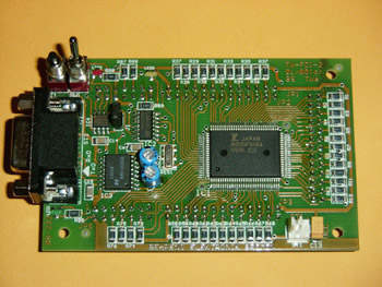 Einer der Nachteile der Fujitsu-Controller ist die für Hobbyzwecke und Kleinserien ungünstige SMD-Bauform als QPF100-Gehäuse. Diese Bauform kann man zwar bei professionell gefertigten Platinen mit Lötstoplack noch relativ problemlos per Hand löten, aber wirklich Spaß macht das nicht. Aus diesem Grund hatte ich vor einer Weile die Idee ein möglichst universelles Evaluationsboard für die Fujitsu-Controller MB90F590 und MB90F595 zu entwickeln, das alle Komponenten die für den Betrieb und Programmierung des Controllers notwendig sind bereits enthält. Herausgekommen dabei ist die unten abgebildete Platine.