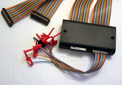 Der Anschluss der Probe erfolgt über zwei Flachbandkabel, die am Ende mit normalen Buchsenleisten versehen sind. Leider ist der Gehäuseauschnitt für die Anschlüsse am Analyzer selbst so klein, dass die Buchsenleisten nur passen, wenn man die Kunststoffblende am Analyzer entfernt.