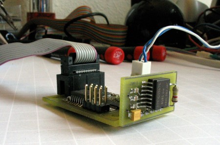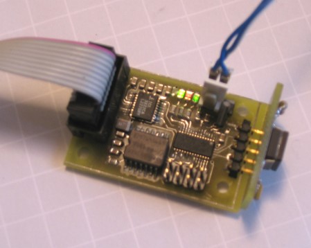 Zweitens wird ein Spannungswandler auf der Platine untergebracht, der die +12V der CTS-Statusleitung auf +3.3V herunterregelt. Dadurch ist keine zusätzliche Spannungsversorgung mehr notwendig. Möglich ist diese Art der Spannungsversorgung, weil die ganze Schaltung im Betrieb mit LEDs kaum mehr als 4mA benötigt.