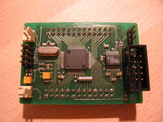 Das MSP430F149-Board ist vergleichbar mit den Headerboards, die z.B. von der Firma Olimex angeboten werden. Die Hauptunterschiede sind die Bauform und das sich auf meinem Board noch ein Pegelkonverter für die RS232-Schnittstelle befindet. Außerdem ist bei meinem Board das Pinning des JTAG-Interface geändert, weil mir die einreihigen 10-poligen Stiftleisten immer zu viel Platz auf den Platinen benötigen.