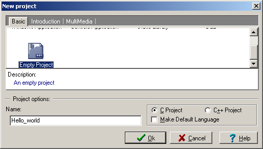 Nachdem ein neues Projekt erstellt wurde muss noch das “Compiler set”, das dieses Projekt nutzen soll festgelegt werden. Diese Einstellung wird in den “Project Options” vorgenommen.