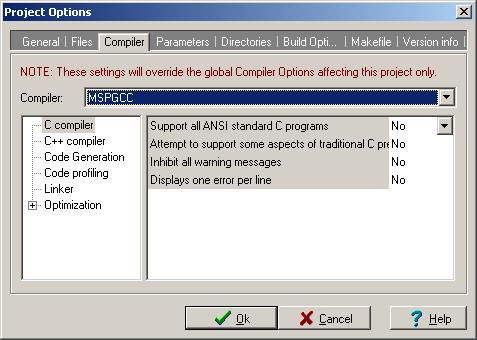 Wenn häufig mit unterschiedlichen Typen der MSP430-Familie gearbeitet wird besteht die Möglichkeit die “mmcu-Option” in den “Project Options” im Bereich “Parameters” einzutragen. In diesem Fall darf die “mmcu-Option” aber nicht in den “Compiler Options” für das MSPGCC “Compiler set” definitert werden, wie es oben angegeben wurde!