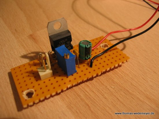 Da ich bisher keine Erfahrung bezüglich des Einsatzes von IR-LEDs zu Beleuchtungszwecken hatte, habe ich für die IR-LEDs eine regelbare Spannungsversorgung mit einem LM317 Linearspannungsregler (siehe Gesamtschaltplan) vorgesehen. Die Durchlassspannung der SFH485 beträgt ca. 1,5V und der maximale Dauerstrom darf 20mA nicht übersteigen. Wenn man als Vorwiderstand für die LEDs jeweils, wie im Schaltplan angegeben, einen 20 Ohm Widerstand einsetzt, muss die Ausgangsspannung des Spannungssreglers mit dem Poti R6 auf einen Wert kleiner als 1,9V eingestellt werden. (Achtung! Bei der Inbetriebnahme erst die Spannung auf einen Wert kleiner 1,9V einstellen und dann die IR-Leds anschließen, sonst sind die LEDs defekt!) Bei meiner Anordnung der IR-Leds hat sich eine Spannung von ca. 1.7V als guter Wert herausgestellt.