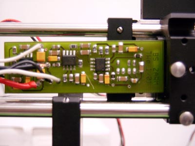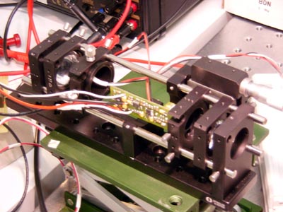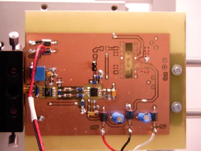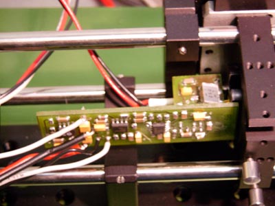 Testboard of the Transimpedanzamplifier with MAX3760: Final Version of the measuring head: (Top board) Small board with amplifier, photodiode & laser diode: Measuring head in optical test assembly: